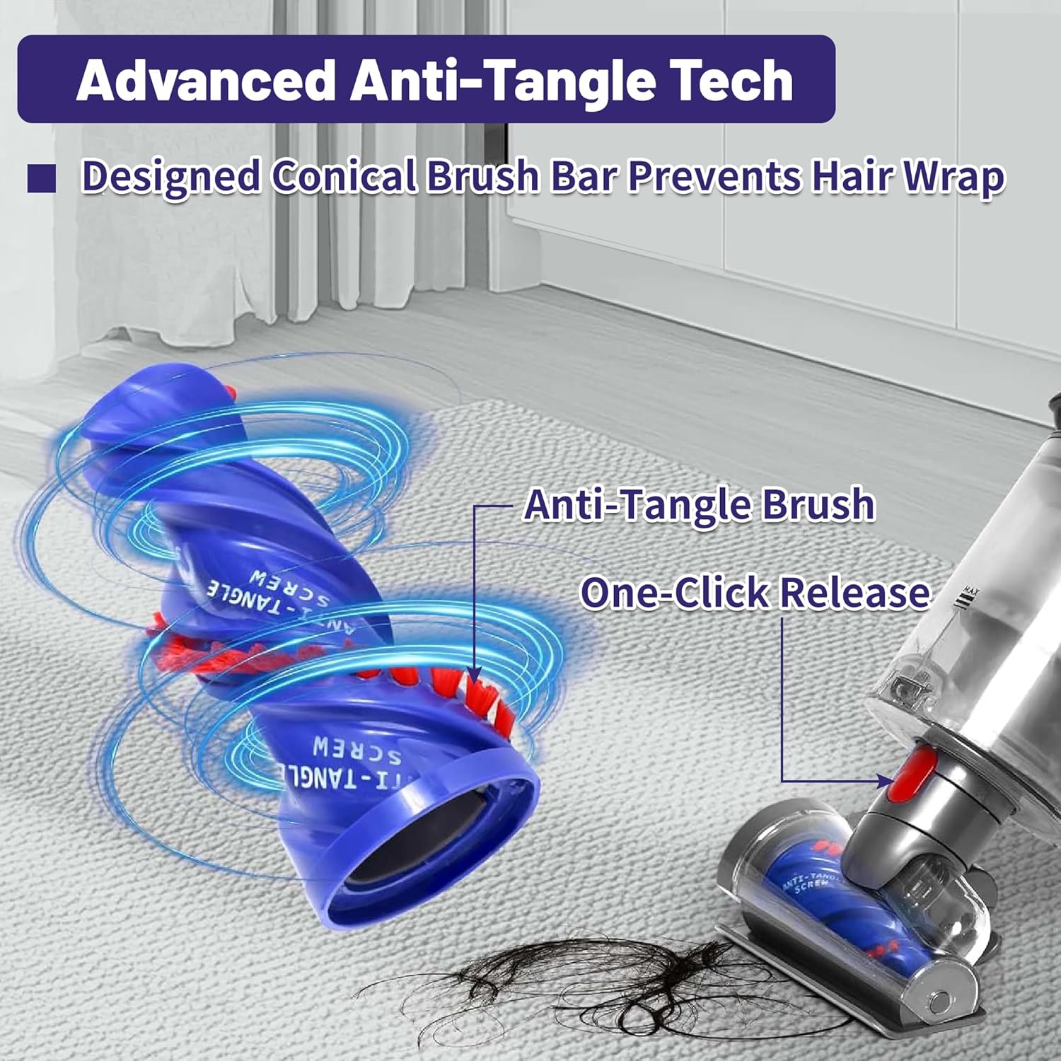 【Anti-Tangle Technology – Perfect for Pets & Long Hair】- Special conical brush design prevents hair wrap, easily picking up pet hair and long human hair from carpets, stairs, sofas, and car seats.