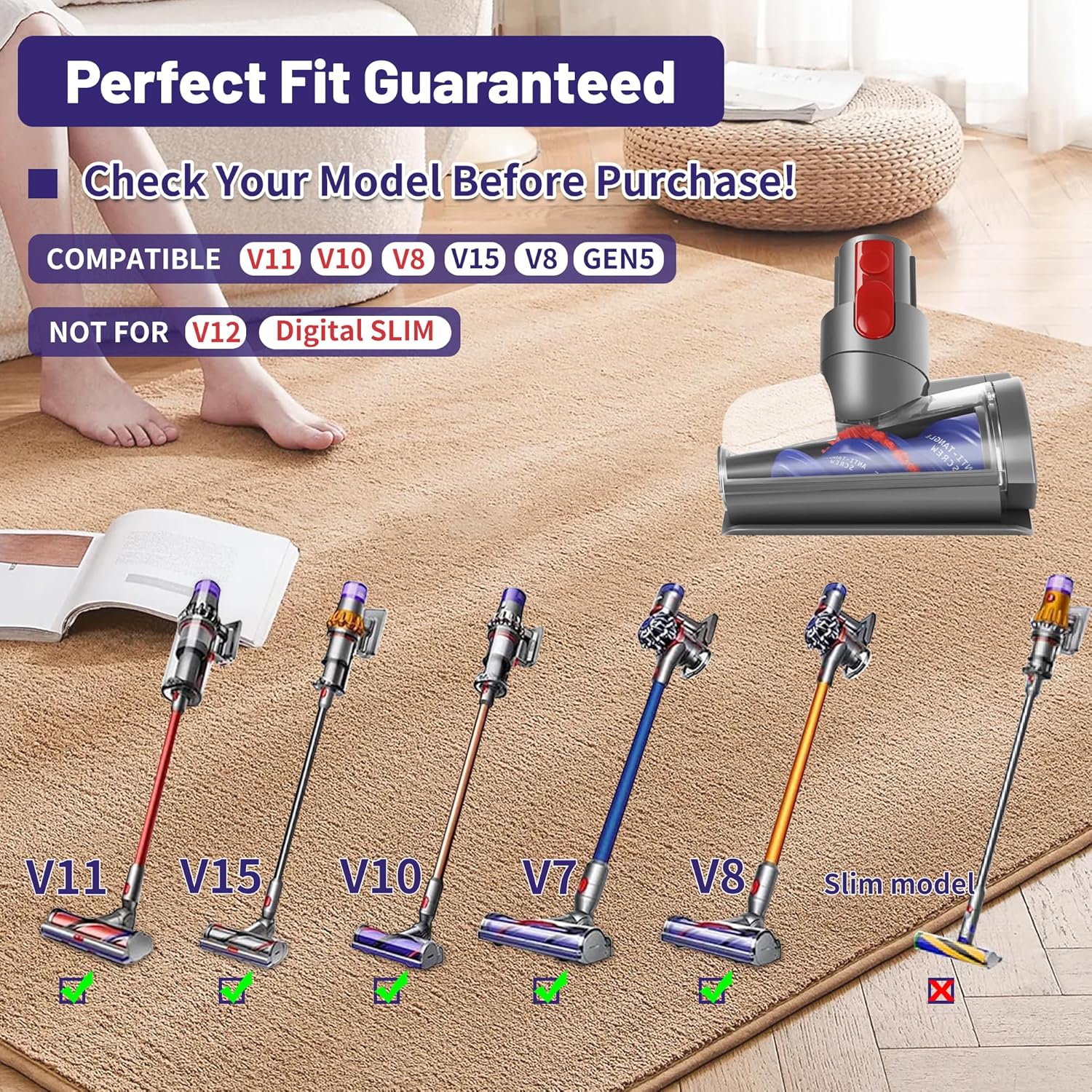 【Wide Compatibility – Dyson V7–V15 Models】- Fully compatible with Dyson V7, V8, V10, V11, and V15 cordless vacuums. Not suitable for Dyson V12 and Digital Slim versions. Please confirm your model before ordering.