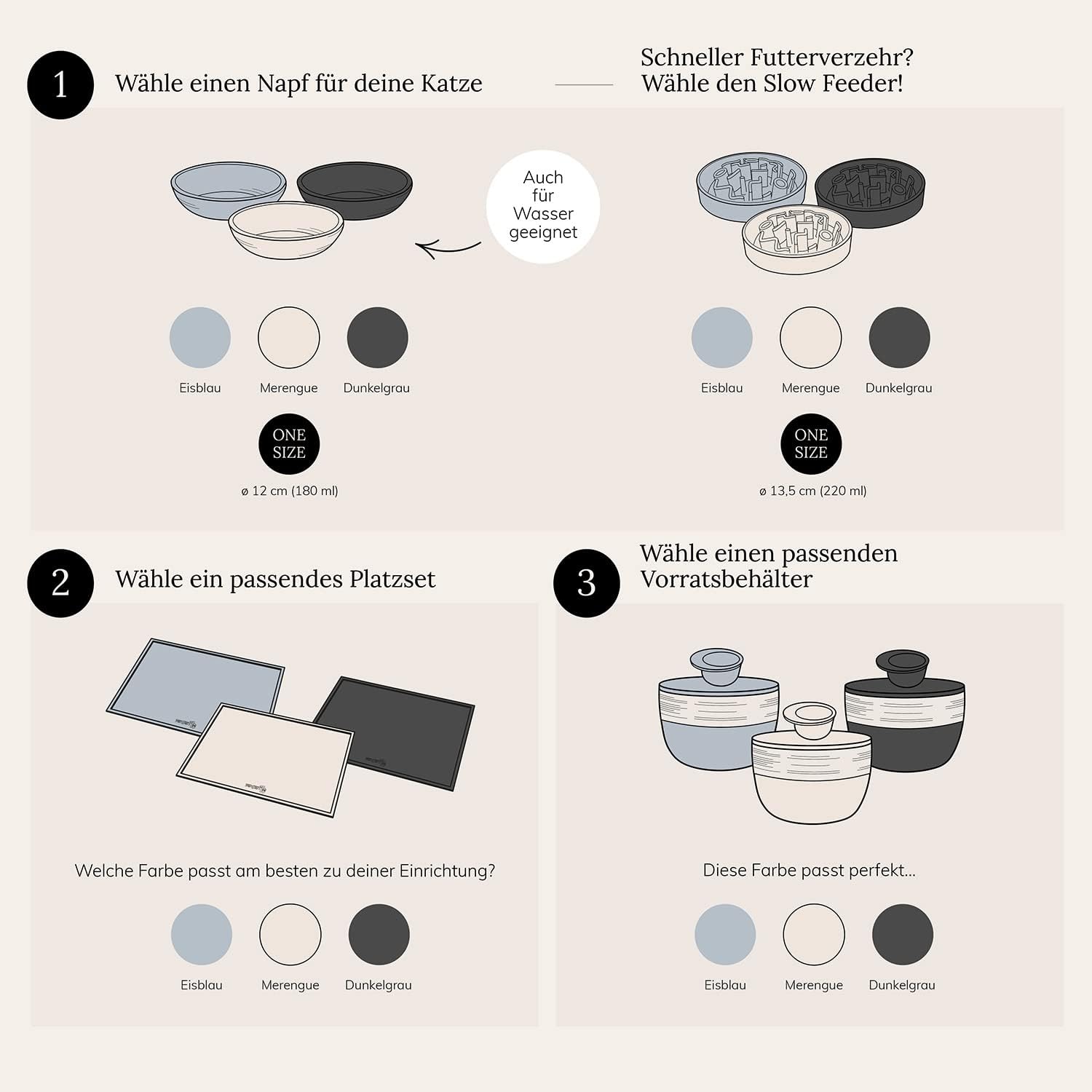 Suitable for food or water Dishwasher safe The flat design allows the cat to eat comfortably and without whiskers stress With non-slip silicone ring on the base that prevents the bowl from being pushed back and forth Do not place in the microwave Available in 3 different colours and sizes, the ideal solution for small and large dogs