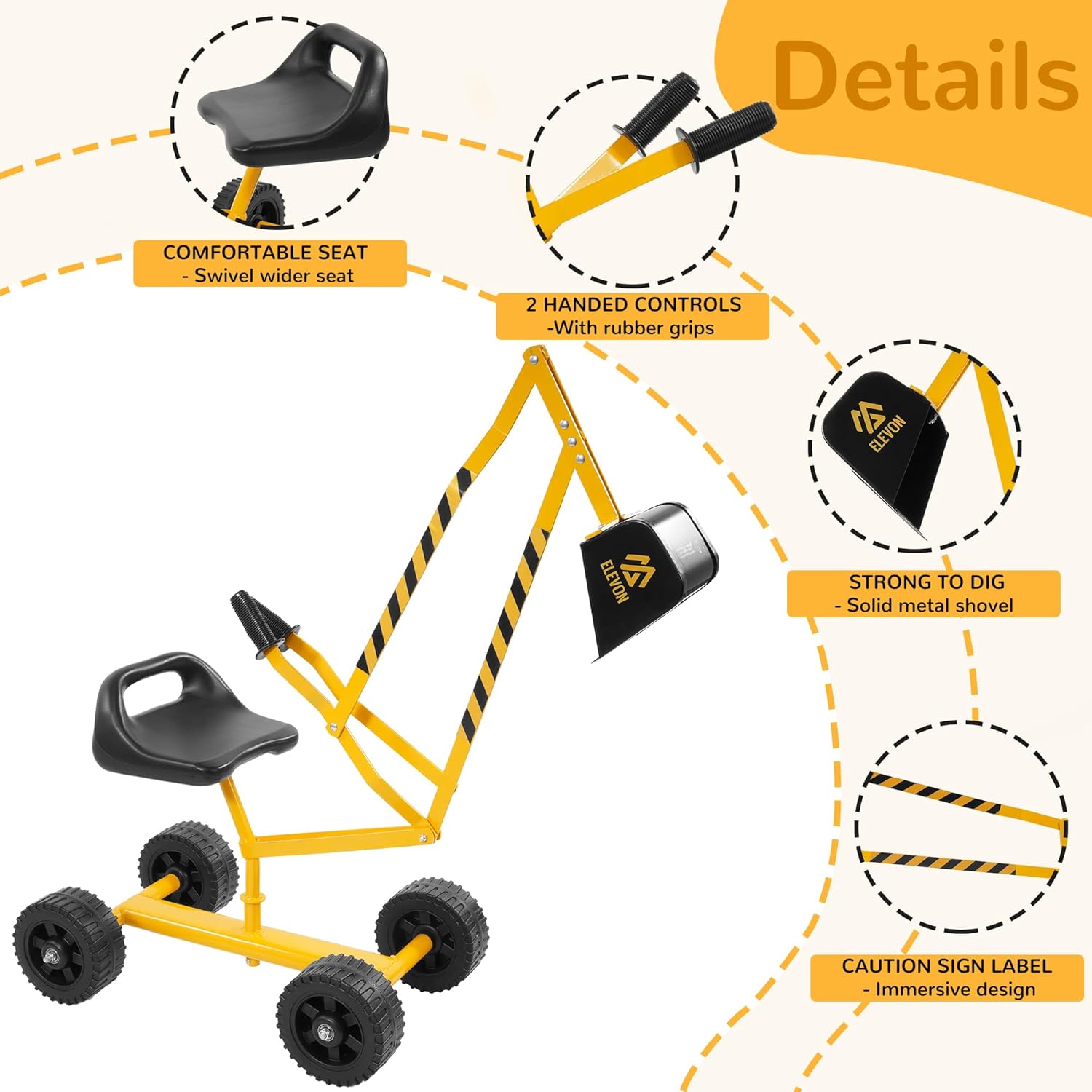 Durable Frame with Wheels: Crafted from robust metal, our excavator toy ensures long-lasting durability. The sandbox digger toy with 4 easy-roll wheels, offers your kids more flexibility to play all around, on grass, gravel road, or sandy beach. With a 140lbs weight capacity, the four casters are durable, allowing your children to play on different grounds and providing a secure foundation.