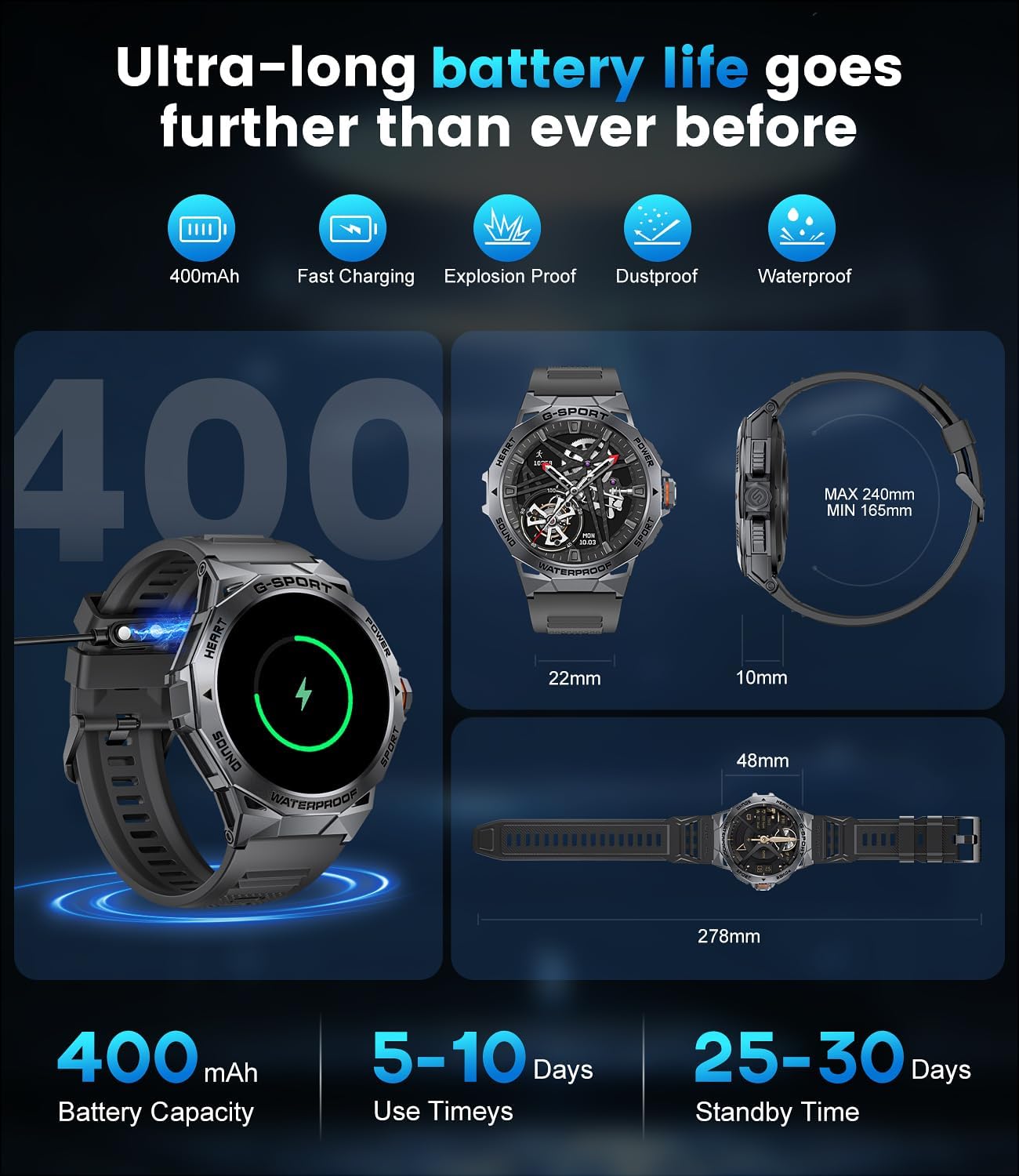 【Military Smart watch & Large Battery Capacity】 Crafted for outdoor enthusiasts, this rugged sport smart watch featuring a distinctive metal case and composite build, able to shock resistance, extreme temperature resistance, an IP67 waterproof rating, and dust-proof construction.The ourdoor smart watch features an 400mAh battery, double the capacity of traditional smartwatches. Equipped with an industry-leading ultra-power-saving AI algorithm, it minimizes power consumption.