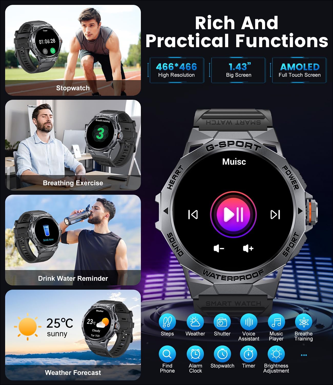 【Newly Upgraded Screen】The smart watch for men feature a large 1.43 inch AMOLED screen, which is more energy-efficient and colourful than LCD.With ultra-high resolution 466*466, it can display vivid and high-definition colours even in outdoor or sunlight, bringing you unprecedented visual clarity. You can also adjust the right brightness to take care of your eyes.In addition, the watch has”Always-on-Display”function, so you no longer need to lift your wrist or touch the screen to check the time.