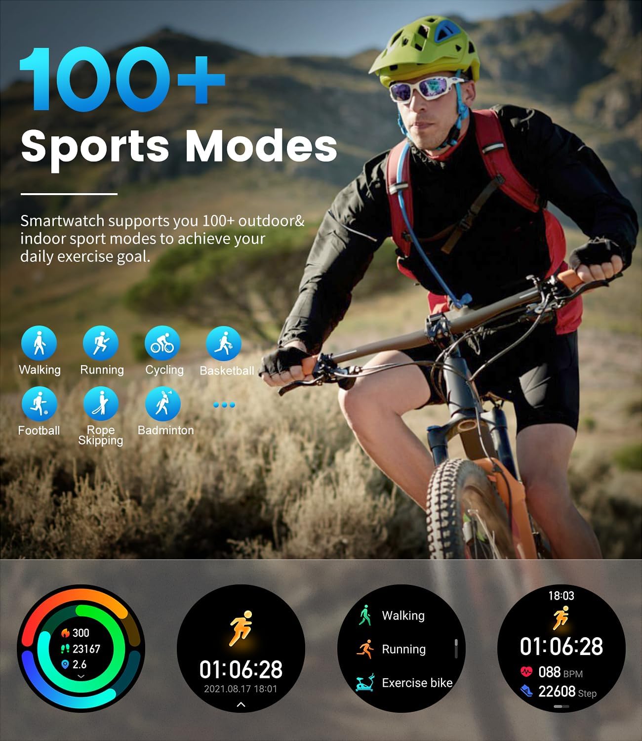 【Monitor Your Activities】Embrace comprehensive activity tracking with fitness tracker watch, boasting support for over 100 sports modes, encompassing activities like walking, running, cycling and tennis, among others. Effortlessly track your advancement and visualize detailed sport-specific data such as step count, distance covered, calories expended, and heart rate. Access this information directly on the android&ios compatible smart watches or conveniently through the “FitCloudPro” app.