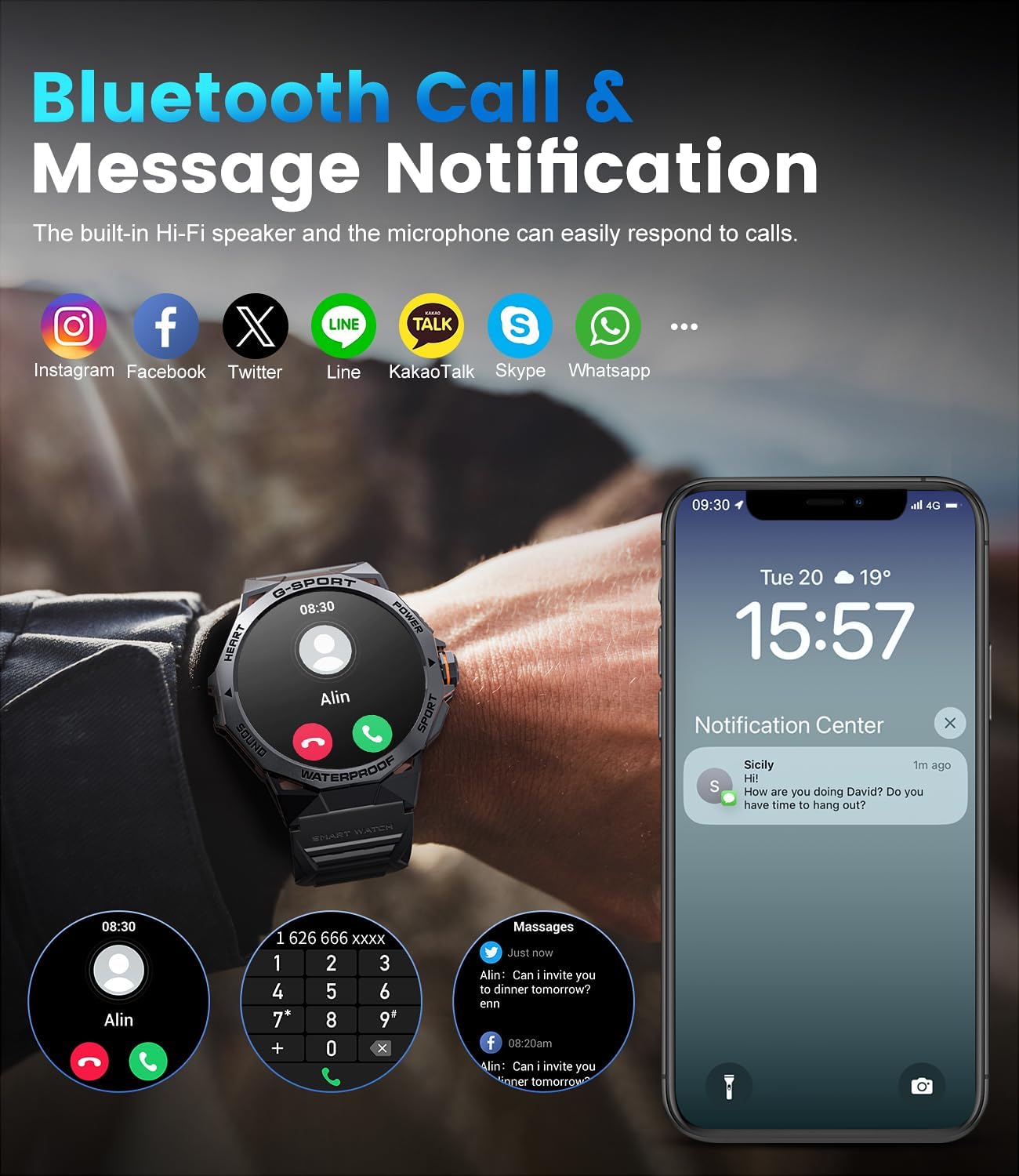 【Call Handling and Message Push】Once linked to your phone through audio bluetooth, you can effortlessly manage incoming and outgoing calls directly from your mens smart watches. Stay connected even when your phone is out of reach, like during jogging or driving. This military watches for men also ensures you stay updated with SMS and app notifications from well-known social media networks like WhatsApp, Facebook, Instagram, Twitter, and others. Never miss any calls and messages.