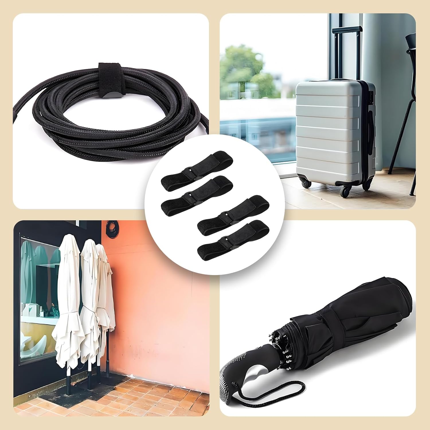 4 PCS Adjustable Straps Yoga Mat Strap, Elastic Straps Adjustable Elastic Strap, Suitable for Fixing Camping Tents, Bike Racks and Road Travel Luggage with Yoga Mats The packaging includes: You will receive 4 pcs cable straps with adjustable design, suitable for securing bulky camping equipment, yoga mats, bicycles, or luggage. Adjustable design: These securing straps have adjustable functions and can be flexibly adapted according to the required length. It is very convenient to use, without the need for tools or additional hardware, and can easily achieve stable fixation. High quality materials: These heavy duty straps are made of high quality materials, which are sturdy, durable, and highly practical. Suitable for easily organizing ropes and securing items. Multi functional applications: These yoga mat carry strap are suitable for indoor and outdoor use. Use them to organize power cords, audio cables, etc. They can also be used as fastening straps for camping equipment, tools, bicycle wheels, and yoga mats. Compact design: These straps heavy duty are lightweight and do not take up space for storage. Whether for daily storage or carrying out, it can be easily handled, making storage and travel more convenient.