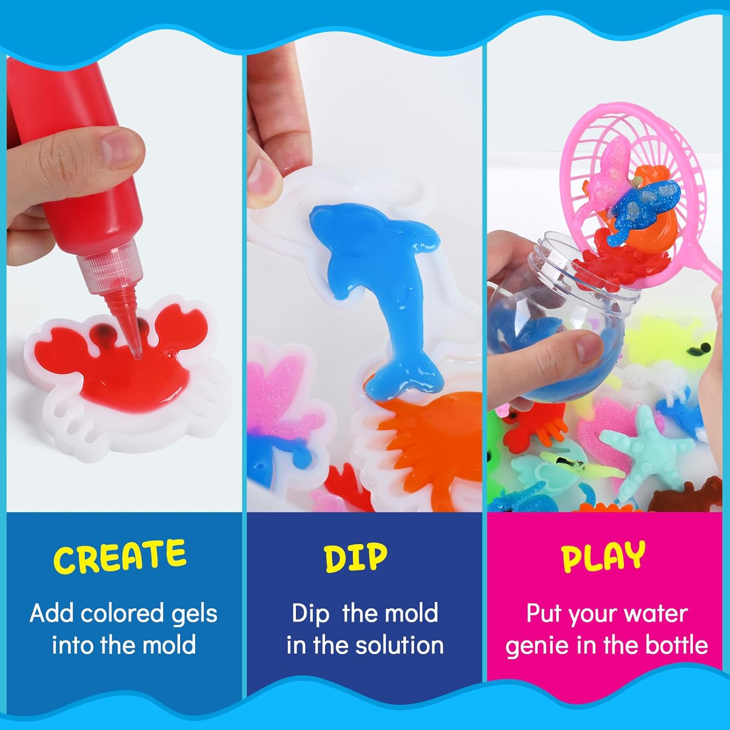 Create Your Own Squishy Toys: Watch the wonder unfold as your child becomes a squishy maker! The process is simple and fascinating: squeeze the magic gel into a mold, wait 30 seconds, demold it in water, and let it solidify. In just over 30 minutes, they will have their very own, custom-made squishy water elf to play with, squeeze, and collect.