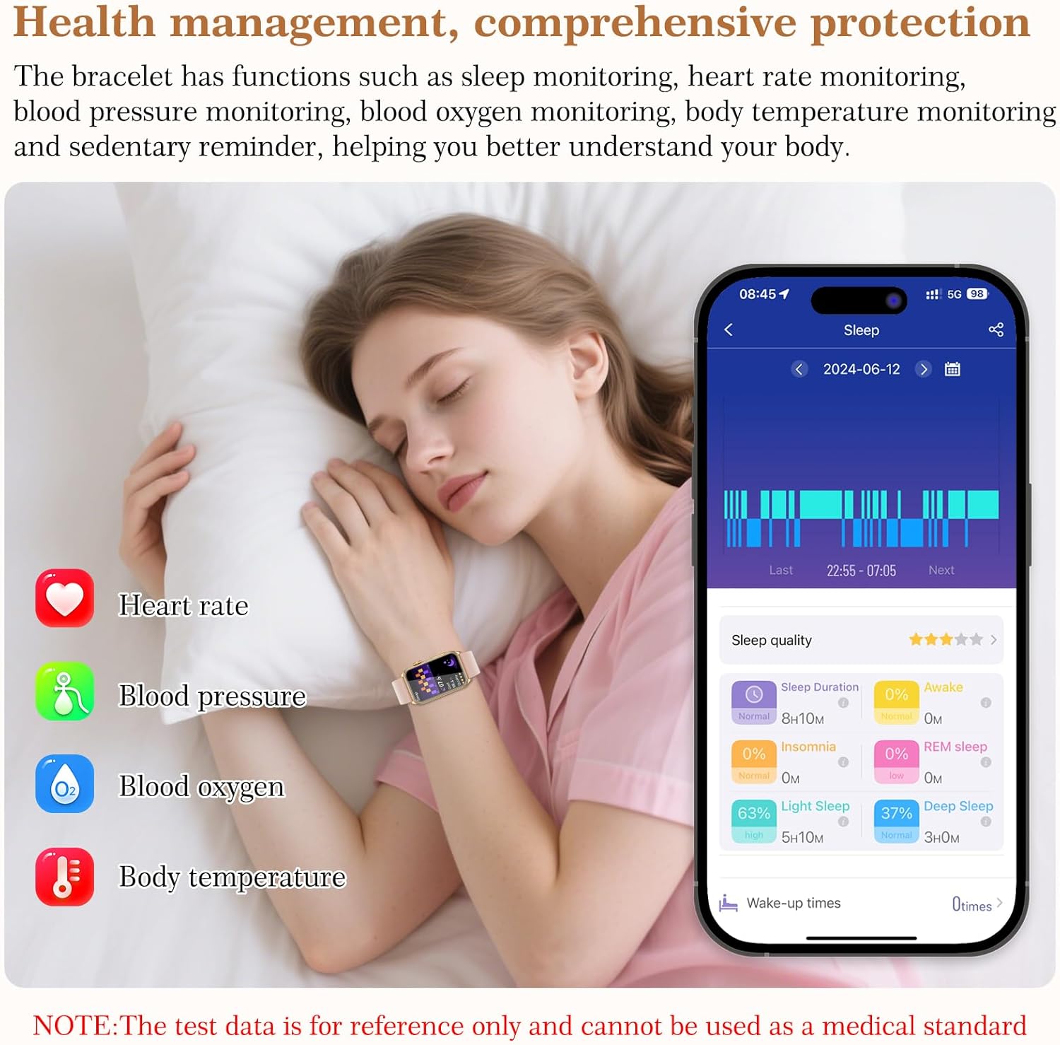 💖【24/7 Health Monitor】: This advanced health tracker allows you to monitor and analyze your heart rate, blood pressure, blood oxygen levels, sleep patterns, blood composition, and temperature 24/7, enabling you to check your health indicators at any time in the [H Band] app. It also offers a sedentary reminder and menstrual cycle management for women, allowing you to adapt your lifestyle accordingly.