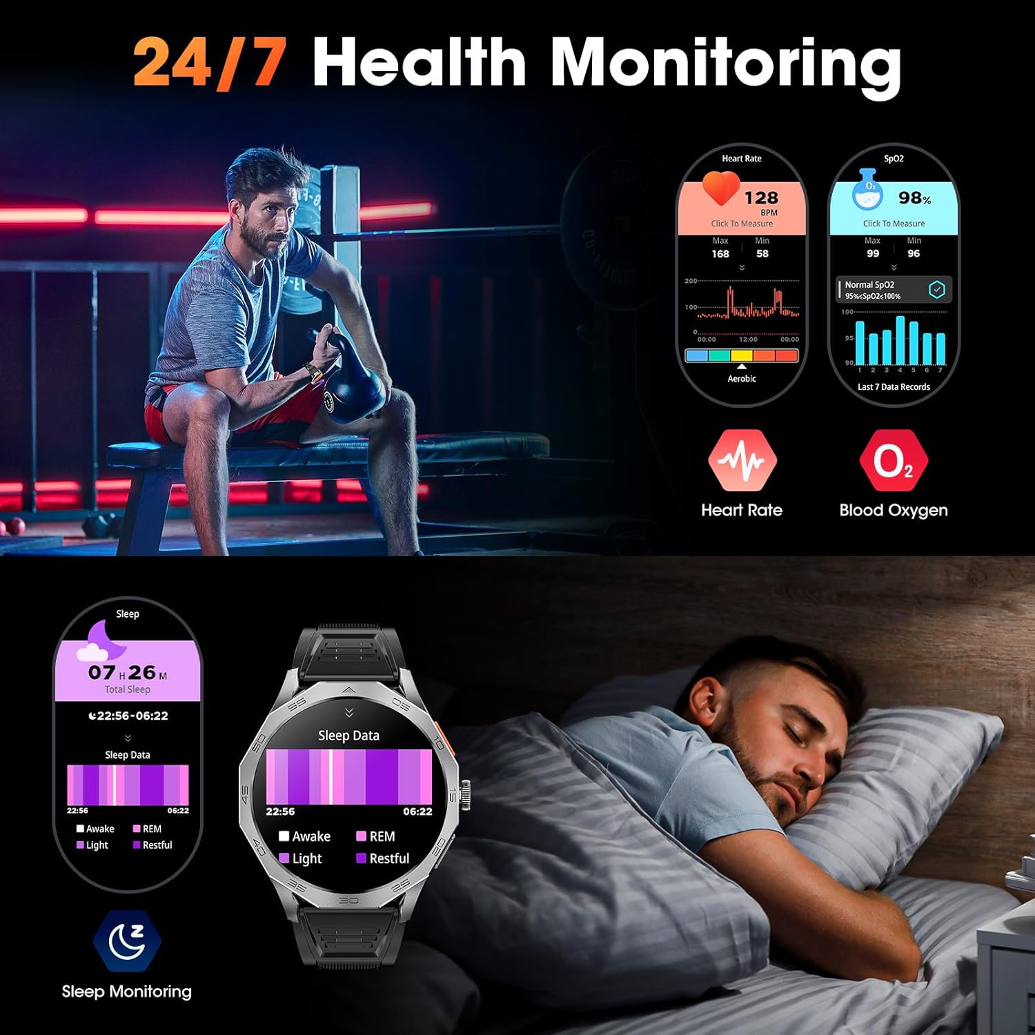 【Military Grade Standard & IP 68Waterproof】Military smart watch for men Made of special composite materials and a metal shell, making it rugged and durable. Waterproof smart watch has passed tests including salt spray, rain, impact.It can continue to function even in very low temperatures.NOTE: Bathing with the smartwatch is not recommended due to factors such as water pressure and temperature. Bathing generates a large amount of water vapor, which can greatly damage the waterproof performance of the product.