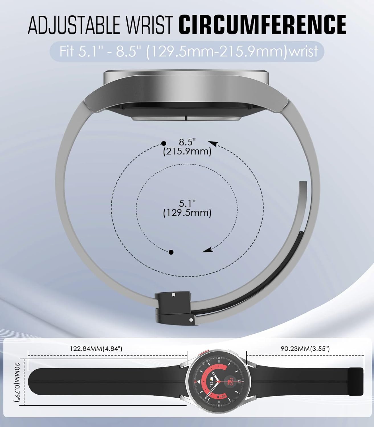 【Wrist Size】- The Galaxy Watch 4 Classic strap fits wrist sizes from 5.1 inches to 8.5 inches (130 mm to 215 mm). Simply open the magnetic buckle fixing button, adjust it to your wrist size, and then press the fixing button to lock it in place. A center-indented stripe runs down the middle of the strap, which adds visual interest.
