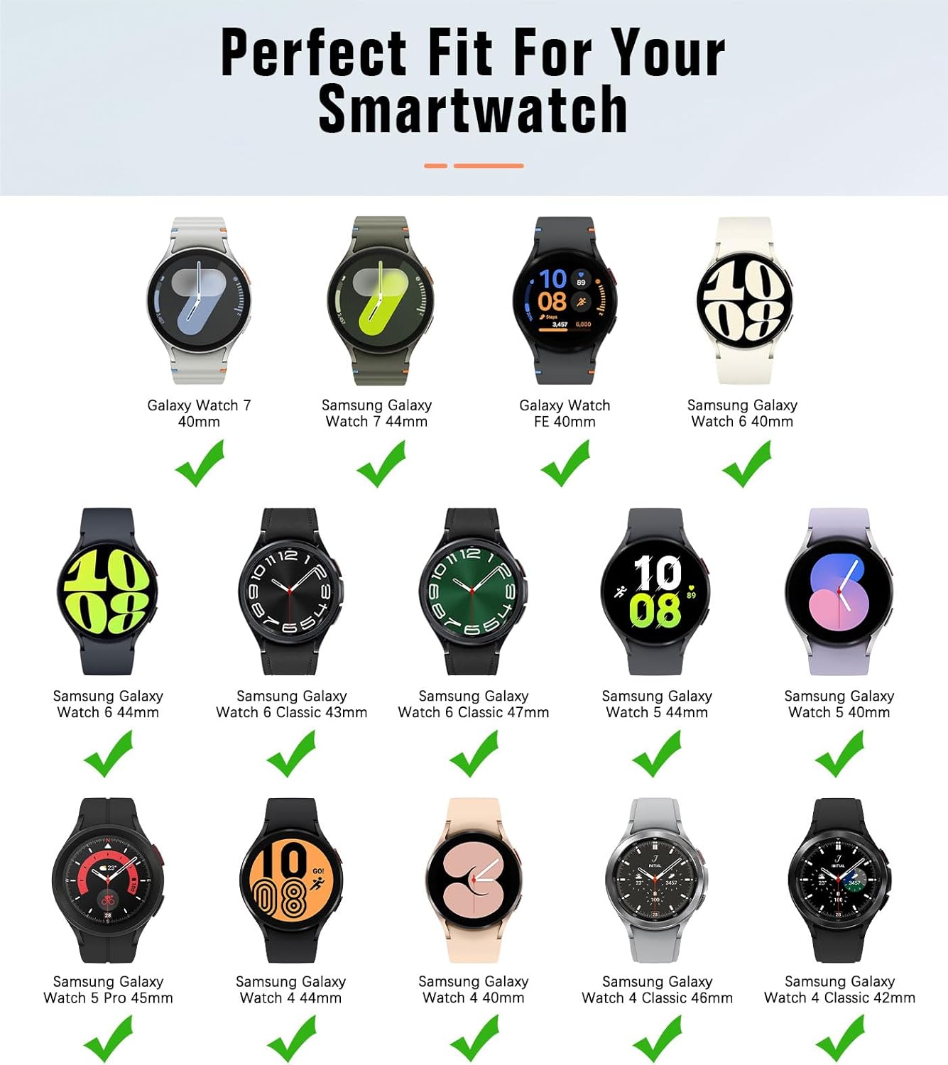 Samsung Galaxy Watch 5 44mm 40mm/ Galaxy Watch 5 Pro 45mm/ Galaxy Watch 4 44mm 40mm/ Galaxy Watch 4 Classic 46mm 42mm Samsung Galaxy Watch 5/ Galaxy Watch 5 pro/ Galaxy Watch 4/ Galaxy Watch 4 Cassic/ Galaxy Watch 3 41mm Samsung Galaxy Watch 4 40mm,44mm/ Galaxy Watch 4 Classic 42mm,46mm/ Galaxy Watch Active/ Galaxy Watch Active 2 40mm 44mm, etc. Samsung Galaxy Watch 4 40mm SM-R860/ Galaxy Watch 4 44mm SM-R870/ Galaxy Watch 4 Classic 42mm SM-R880/ Galaxy Watch 4 Classic 46mm, etc. Galaxy Watch 5 40mm/44mm, Galaxy Watch 5 Pro 45mm/ Galaxy Watch 5 Golf Edition 40mm/ Galaxy Watch 5 Golf Edition 44mm/ Galaxy Watch 5 Pro Golf Edition 45mm