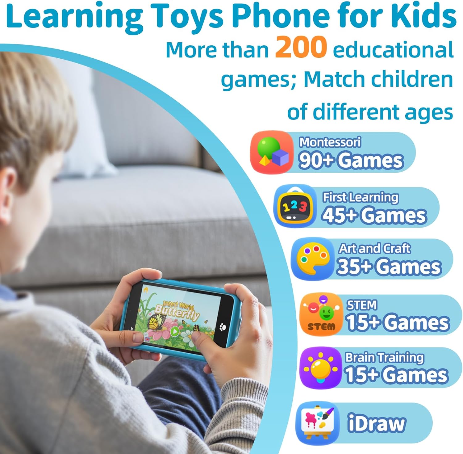 200+ Educational Games: Kids toys kids phone toys for ages 3-8, featuring over 200 fun educational puzzle games! A new game every day for half a year – never the same twice! From ABCs to 123s, critical thinking to creative art, our massive game collection keeps up with your child’s growing needs. They’ll learn fundamentals naturally while having fun! Kids smart phone is the ultimate learning buddy for happy growth
