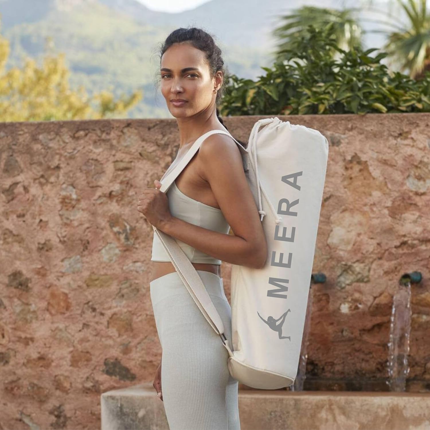 Yoga Mat Bag Printed with Name This personalised yoga mat bag is made from premium, heavyweight, 100% organic certified cotton, the rope drawcord closure keeps your contents secure, while an extendable webbing shoulder strap provides maximum, customisable comfort. With the added benefit of a hidden zippered valuables pocket, the yoga mat bag is the perfect companion to allow you to focus all your energy on any yoga class. This personalised yoga mat bag is the perfect example of sustainability and durability combined. Printed in block capitals or script font (Please message us if you require a different font or logo) Plus a choice of logos. SPECIFICATION Contains 100% OCS-certified organic cotton, certified by Control Union CU811033. Premium, heavyweight fabric. Concealed, zipped valuables pocket. Rope drawcord closure. Adjustable webbing shoulder strap. Fits most yoga mat sizes. Dimensions – 19 x 69 x 19cm Fabric – 100% Organic cotton canvas 340gsm Colours – Amber, Black, Light Grey or Natural PLEASE NOTE – Yoga mat is NOT included