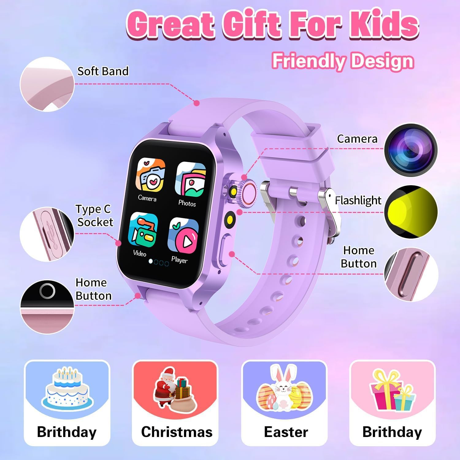 All functions are built into the kids watch, no need for SIM card, no need to connect it to your cell phone to download any application software, suitable for daily use by children aged 3-11 years old, let your child grow up happily with smart watch for kids, simple operation and easy to use.