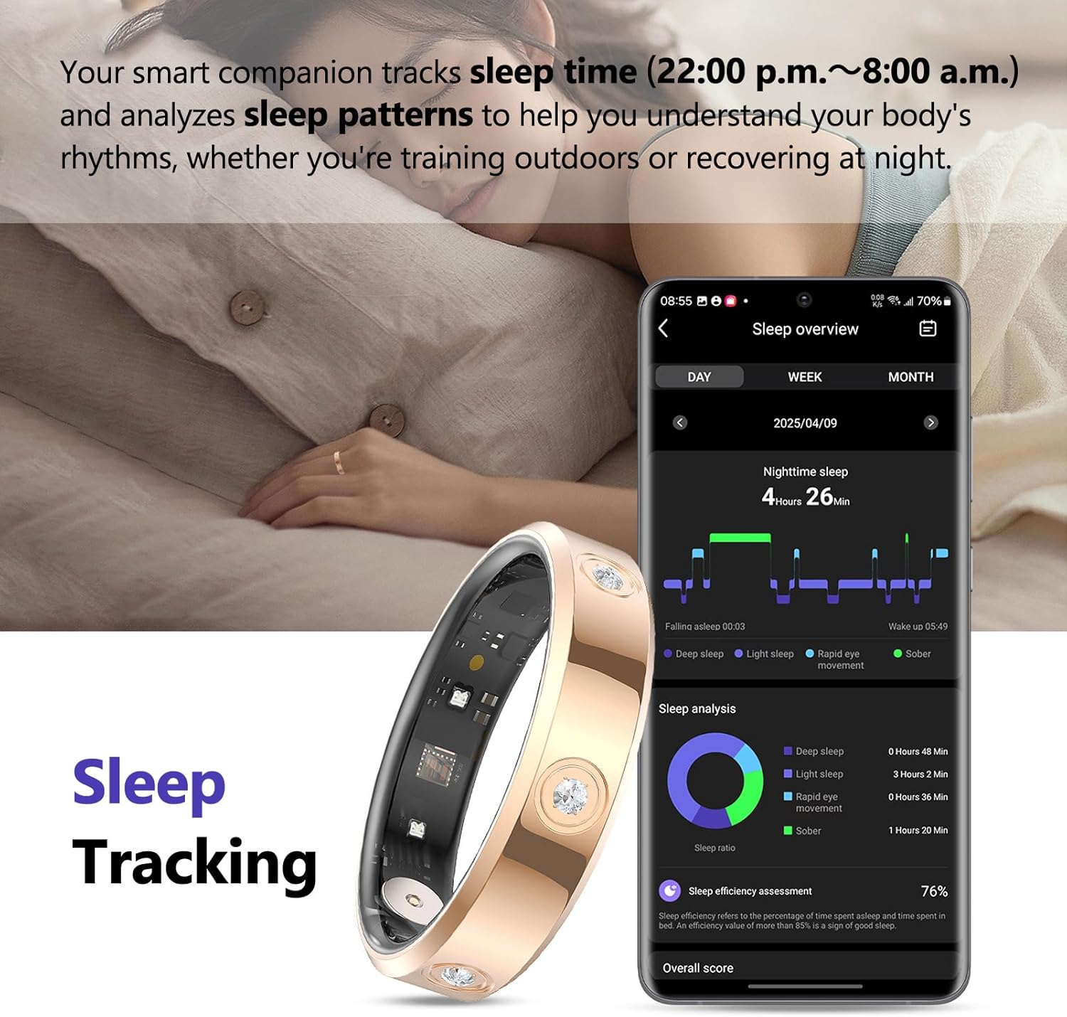 Health Ring: Smart ring uses optical sensor to monitor your body data – heart rate, HRV, providing intuitive data support. The built-in gravity sensor estimates your sleep time and provides feedback on sleep quality as a reference.
