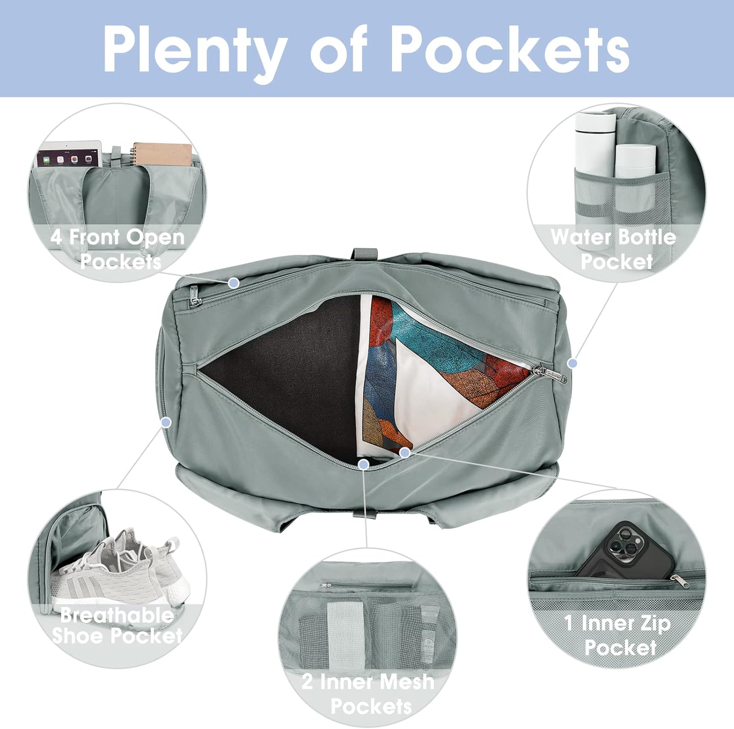 Separate Shoes Compartment and Zippered Wet Pocket: This gym tote is engineered with shoes and wet compartments. They make it easy to pack an extra pair of shoes and wet toiletries or swimming suits, keeping other stuff dry and clean.